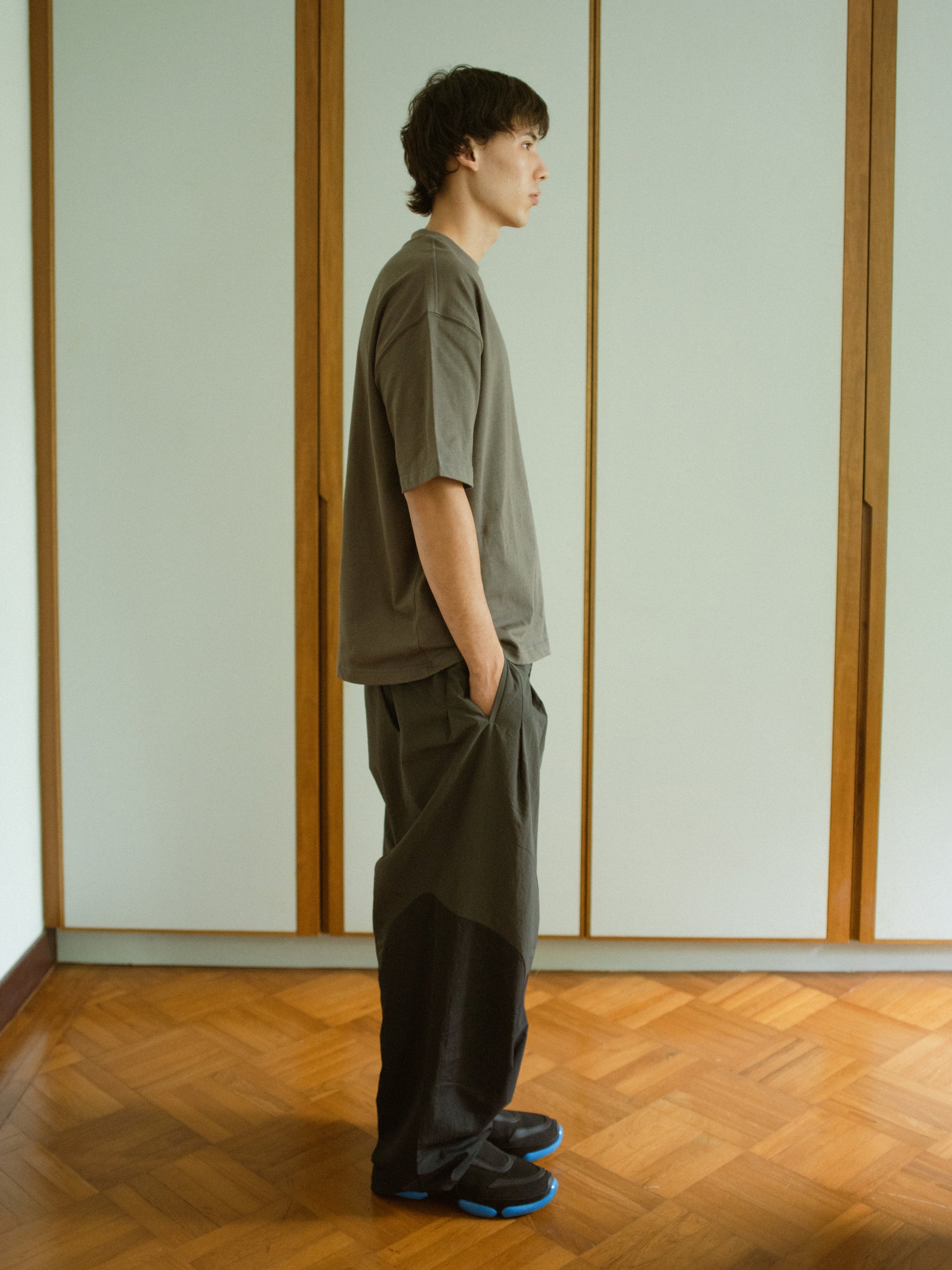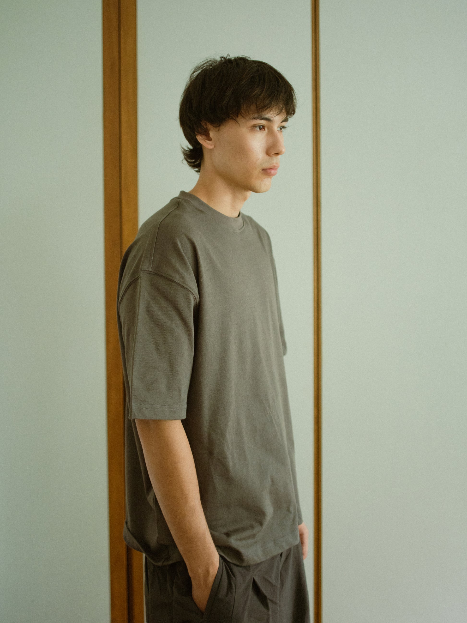 The Cropped Box Tee embodies modern minimalism with its structured boxy cut, tailored in 100% heavyweight compact-combed cotton (230–240 GSM) for a refined drape and structured elegance. The relaxed proportion is defined by dropped shoulders and a deep rib-knit collar in a supple cotton-spandex blend, ensuring exceptional elasticity and enduring shape over time.